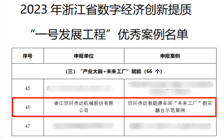 近日,省數字經濟創新提質“一號發展工程”專班辦公室公布2023年浙江省數字經濟創新提質“一號發展工程”優秀案例名單公布,經專班初審、案例路演及專家評審會后,由雙環傳動申報的《雙環傳動新能源車間“未來工廠”數實融合示范案例》榮登榜單。