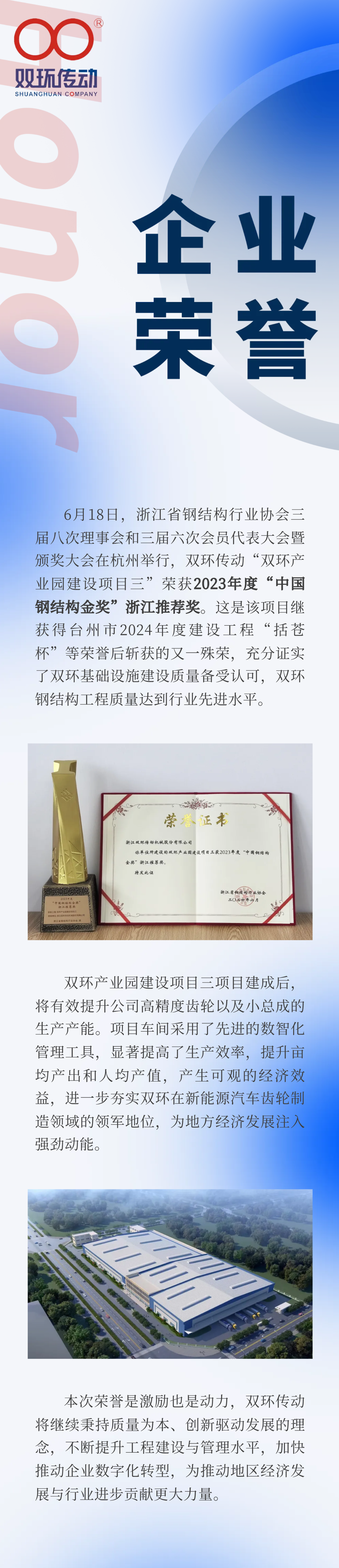 喜訊!“雙環產業園建設項目三”榮獲“中國鋼結構金獎”浙江推薦獎!