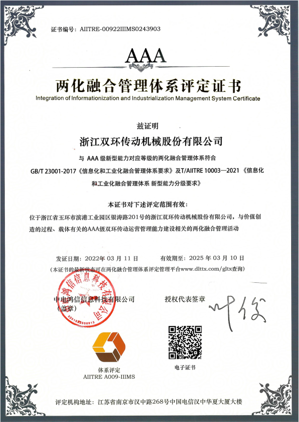 近日,從國家工業(yè)和信息化部傳來喜訊,雙環(huán)傳動聚力聚智打造的“運營管理能力”新型能力,順利通過《信息化和工業(yè)化融合管理體系要求》(GB/T 23001-2017)及《信息化和工業(yè)化融合管理體系新型能力分級要求》(T/AIITRE 10003-2021)體系認(rèn)證,成為浙江省首家獲得AAA級認(rèn)證的企業(yè)。AAA級(流程級)也是目前兩化融合管理體系可申請的最高認(rèn)證等級。這標(biāo)志著雙環(huán)傳動信息化與工業(yè)化、數(shù)字化深度融合獲得權(quán)威認(rèn)可,為企業(yè)數(shù)智化發(fā)展打下堅實基礎(chǔ)。