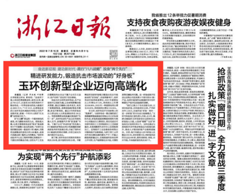 7月15日,《浙江日?qǐng)?bào)》頭版頭條刊發(fā)了題為《精進(jìn)研發(fā)能力,鍛造抗擊市場(chǎng)波動(dòng)的“好身板” ,玉環(huán)創(chuàng)新型企業(yè)邁向高端化》文章,用大篇幅報(bào)道了雙環(huán)傳動(dòng)在研發(fā)創(chuàng)新領(lǐng)域的生動(dòng)詳實(shí)的案例。